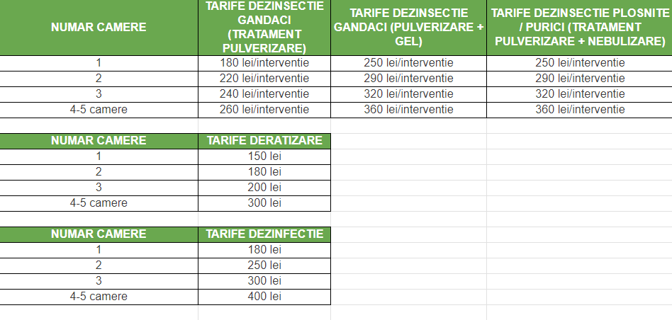 Suntem specializați în furnizarea serviciilor profesionale de deratizare, dezinsecție și dezinfectare. Ne preocupăm de sănătatea și siguranța clienților noștri și oferim soluții eficiente pentru a elimina și preveni infestările de dăunători. Astfel asigurându-vă un mediu sigur și igienic. Iată lista de tarife pentru serviciile noastre, în funcție de tipul spațiului: